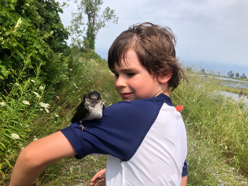 - a fledging purple martin was stuck in the grass. after a short rest on the boys its second flight was a success! there was cheering.
