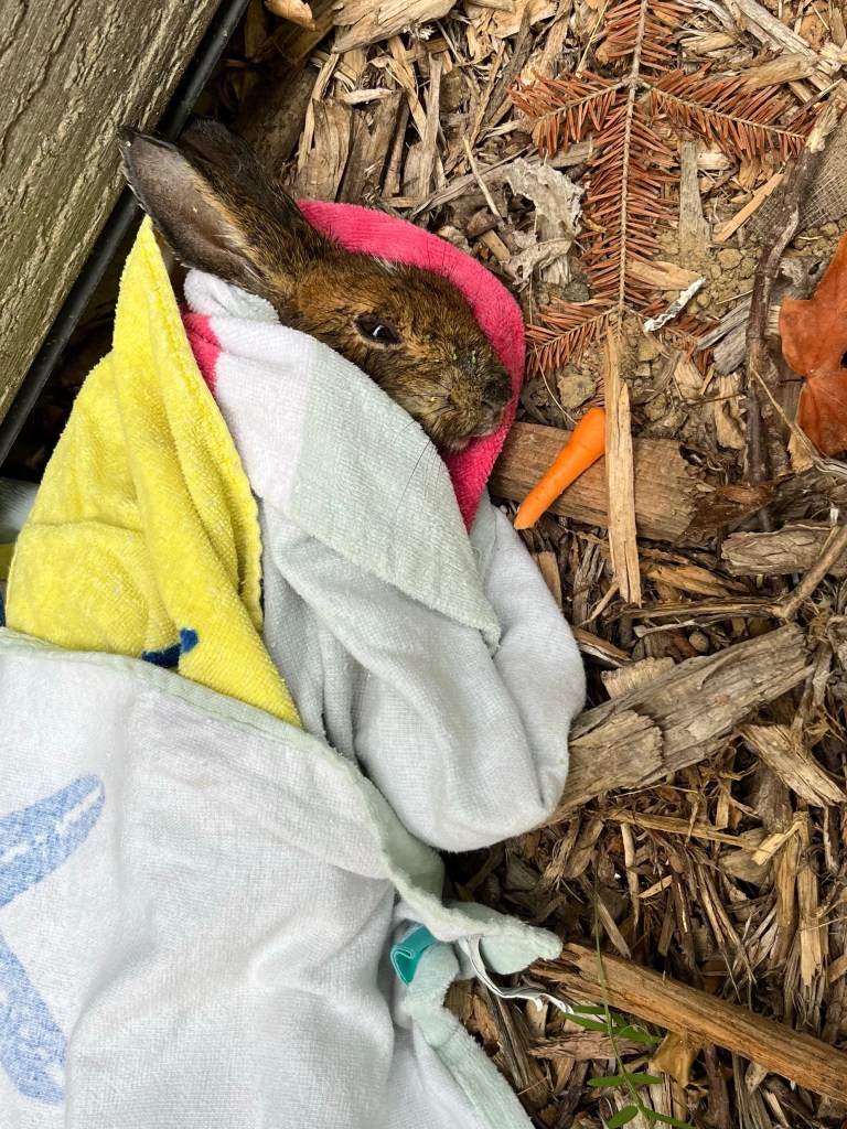 saved from what appeared to be a possible attack/drowning, this bunny – known now as Murray Marshall Currie was promptly wrapped and left to recover safely inside a hamper in the garage.